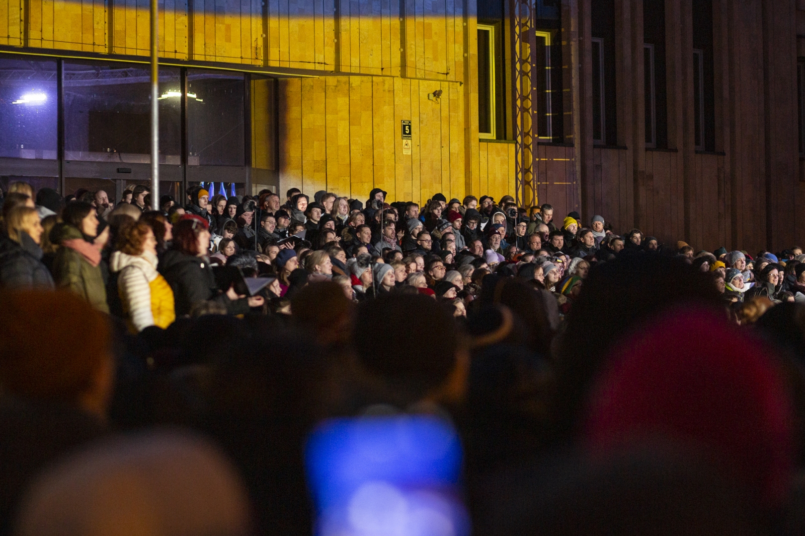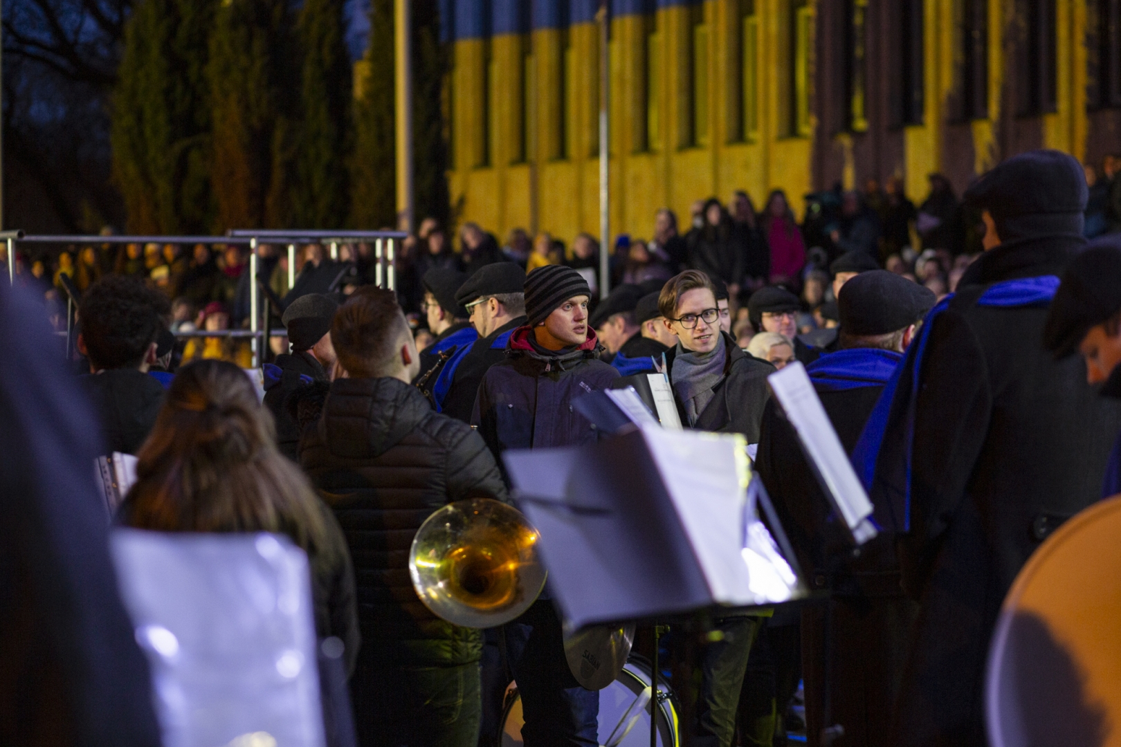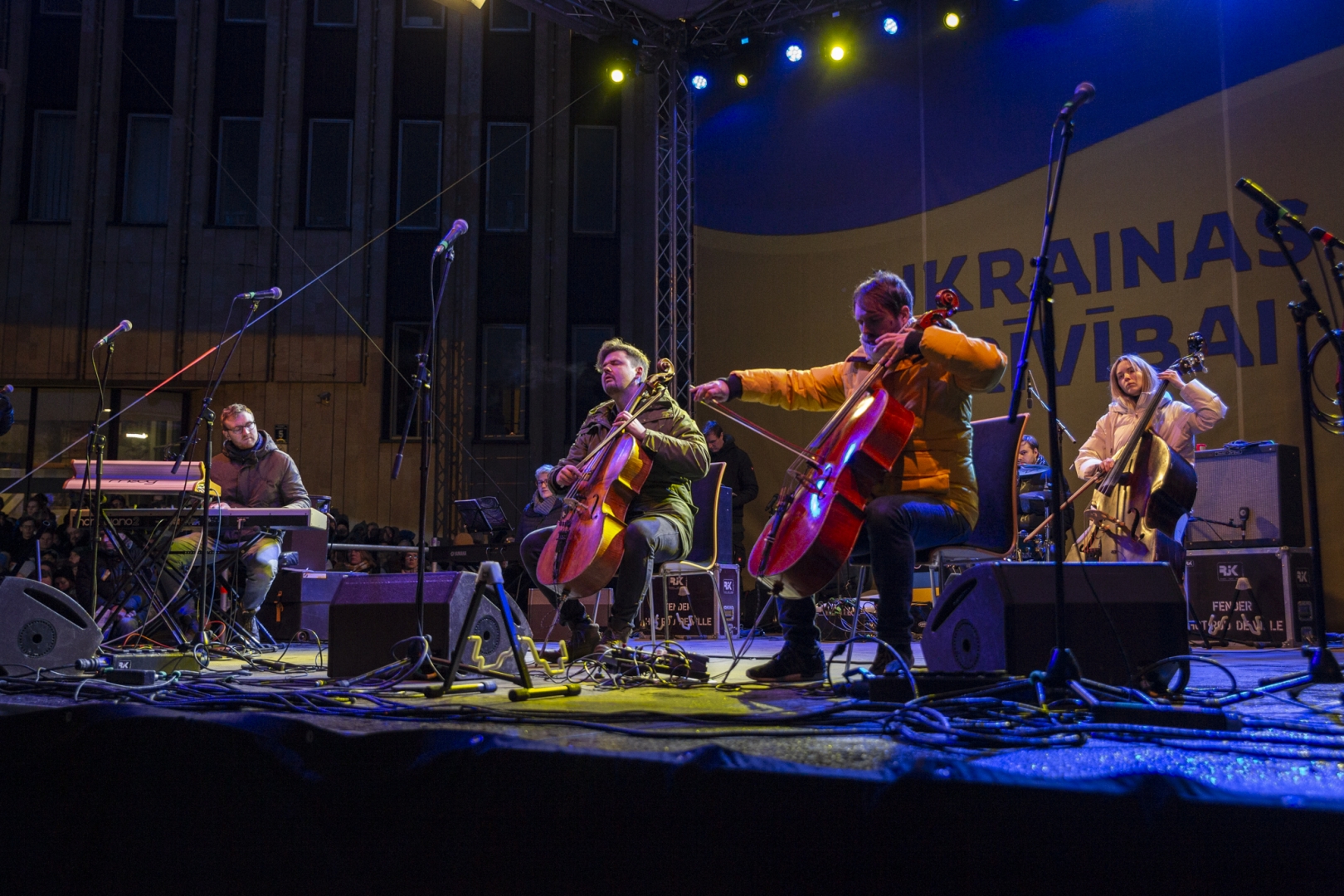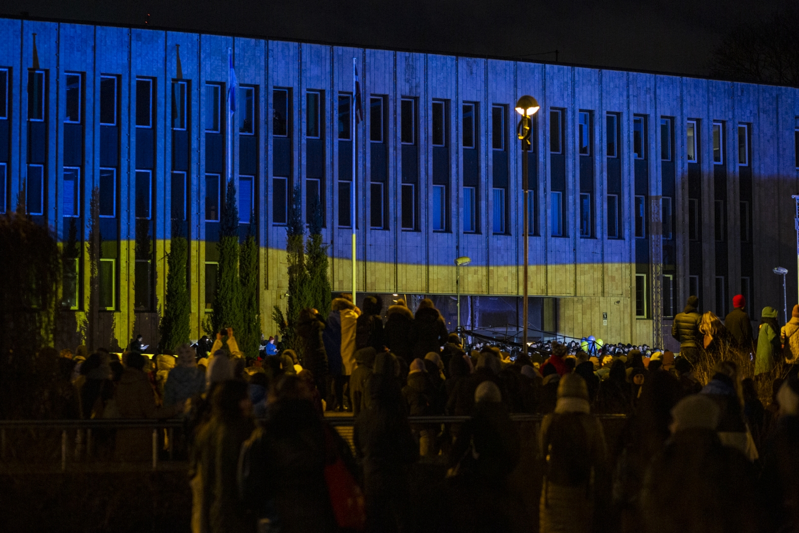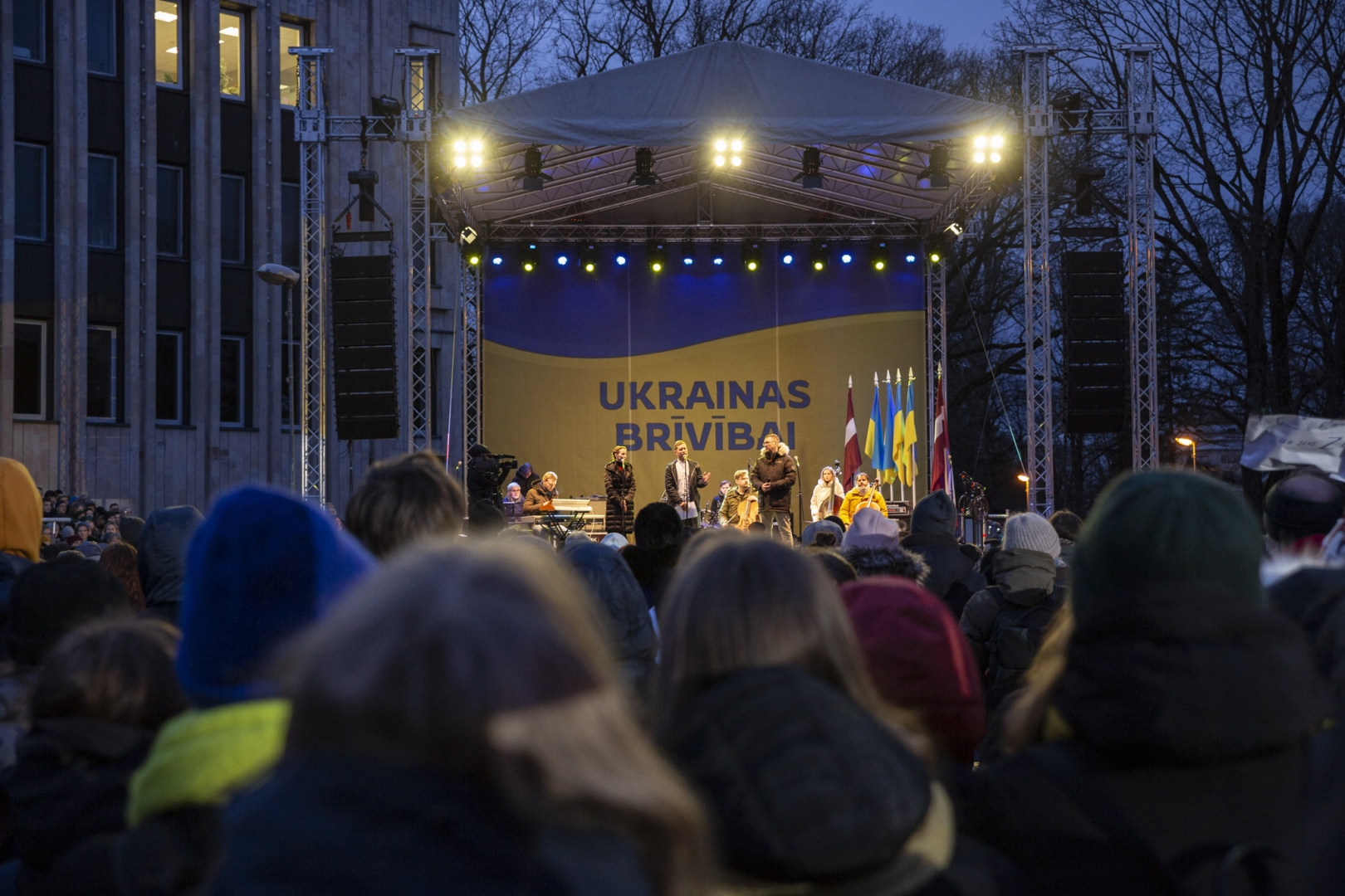 Piektdien 25. februārī no plkst.18:00 laukumā pie Rīgas Kongresu nama Latvijas mūziķi un Latvijas Dziesmu un deju svētku kustības dalībnieki - kori, pūtēju orķestri, tautas deju kolektīvi un folkloras kopas - veltīja savus priekšnesumus Ukrainas atbalstam, vienojoties koncertā “Ukrainas brīvībai”.