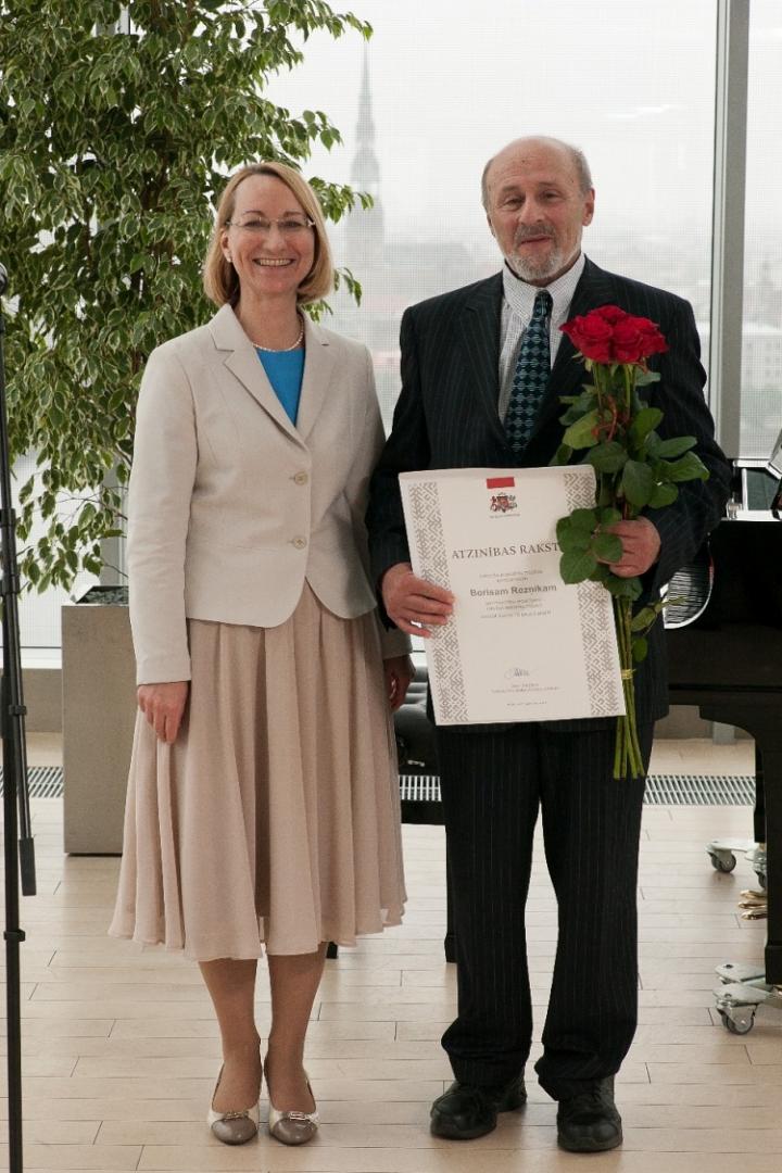 • Tāpat Kultūras ministrijas Atzinības rakstu saņem komponists un mūziķis Boriss Rezņiks, kurš šogad atzīmē 70 gadu jubileju. Viņš ir radījis ļoti daudzas melodijas grupai „Eolika”, kas teju ikvienu Latvijas iedzīvotāju priecējušas dažādos dzīves brīžos. Piemēram, viņa dziesmas „Atmostas Baltija” pavadījumā rokās sadevās daudzi tūkstoši cilvēku Baltijas ceļā.