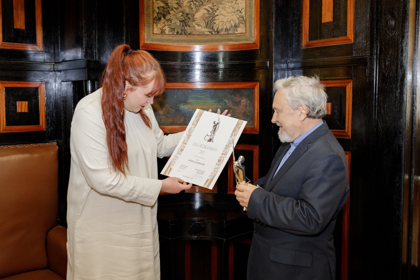 Kultūras ministre pasniedz Lielo mūzikas balvu par mūža ieguldījumu pianistam Arnim Zandmanim