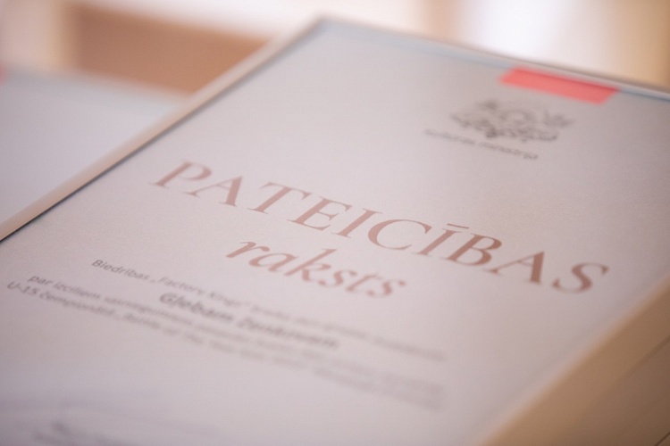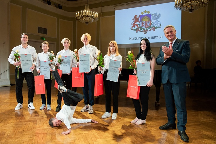 - Kultūras ministrs Nauris Puntulis kopā ar KM apbalvojuma laureātiem - biedrības „Factory Kingz” breika deju grupu no Daugavpils.