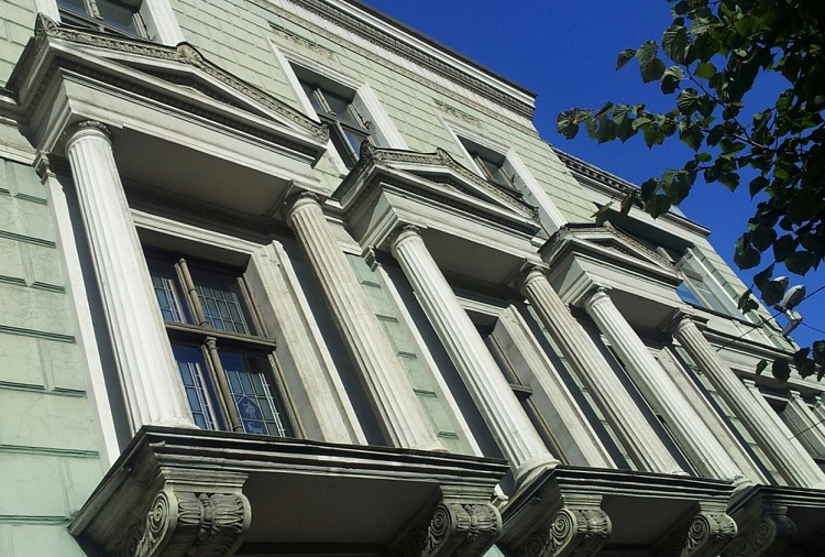 - Ēkas fasādi rotā rusti un ar izteiksmīgiem frontona tipa sandrikiem akcentētas logailu grupas. Vietām jumta dzegu papildina balustrāde. Foto: Jānis Dripe
