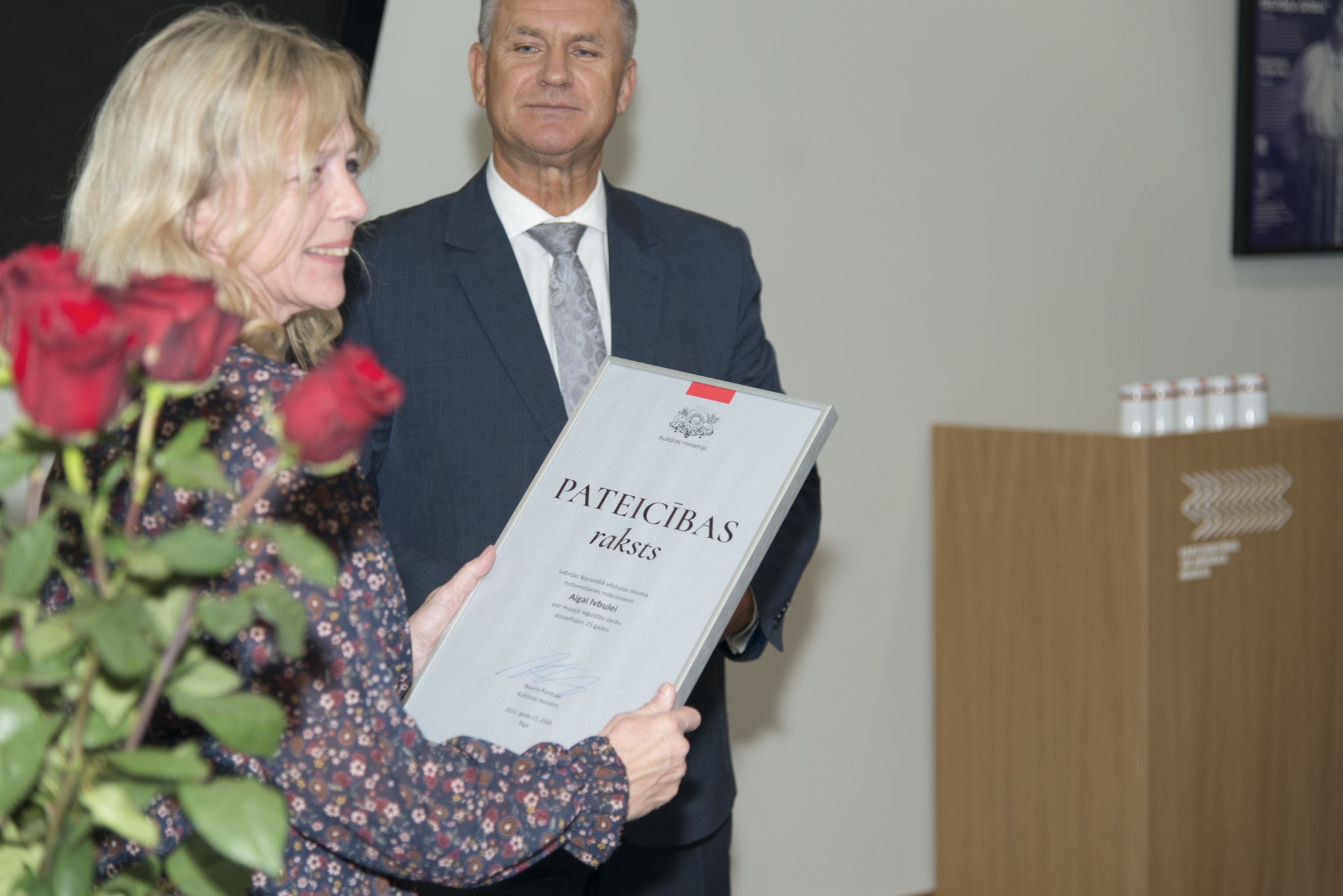 Kultūras ministrs Nauris Puntulis pasniedz Kultūras ministrija Pateicības rakstus muzeju nozares profesionāļiem