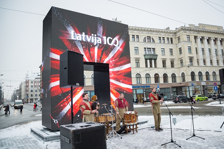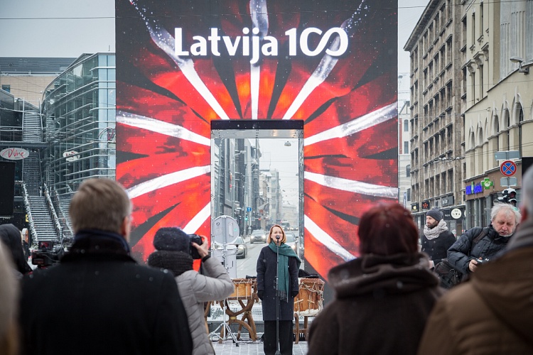 18.01 Brīvības alejas spicē (Brīvības un Elizabetes ielu krustojumā) kultūras ministre Dace Melbārde kopā ar Rīga.lv pārstāvjiem atklāja īpašu dāvanu LV100 - Goda vārtus. Objekta „Goda vārti” idejas un dizaina autors ir mākslinieks Visvaldis Asaris, bet tā mākslinieciskās programmas 3D projekciju autors – videomākslinieks Māris Kalve. Savukārt pieminekļa saturisko vēstījumu izstrādājis dzejnieks Andris Akmentiņš. Vides mākslas objekts veidots no ekrāniem, kuru uzstādīšanu veic vietējais LED tehnoloģiju ražošanas uzņēmums SIA „Palami”.