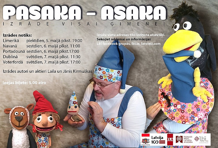 - KM atbalstītā projekta ietvaros maija sākumā Īrijā un Ziemeļīrijā viesojās Laila un Jānis Kirmuškas ar izrādi bērniem un pieaugušajiem „Pasaka-asaka”