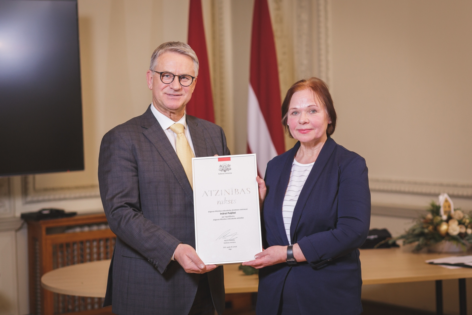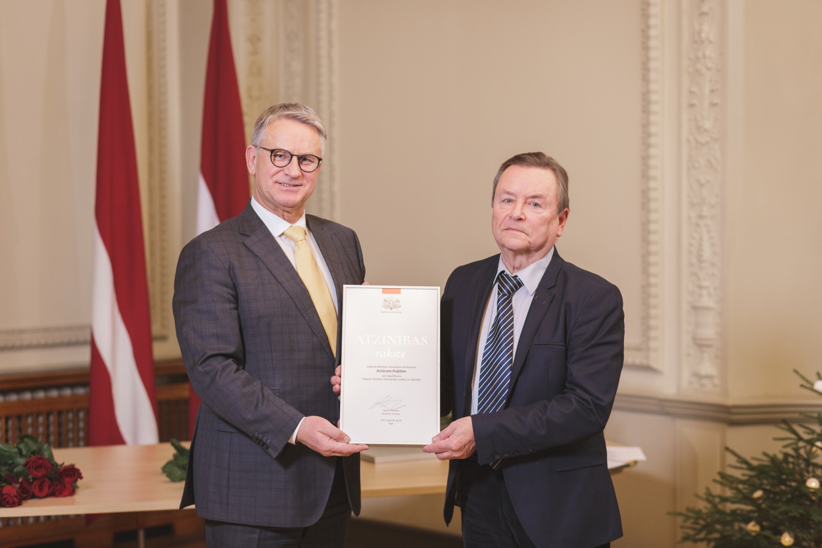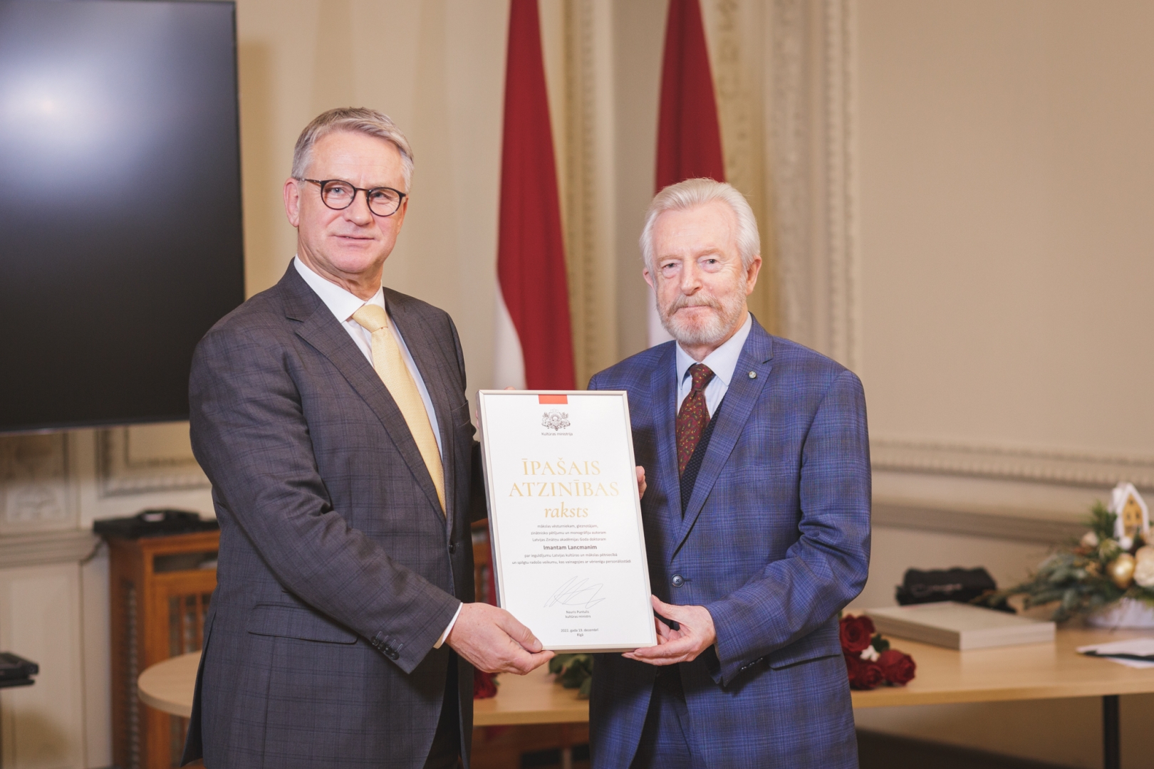 19. decembrī, tika godinātas izcilas kultūras personības - kultūras ministrs Nauris Puntulis Ministru kabineta Atzinības rakstus un Kultūras ministrijas (KM) Atzinības rakstus par mūža ieguldījumu vai nozīmīgu devumu pasniedza 11 ilggadējiem nozares darbiniekiem.