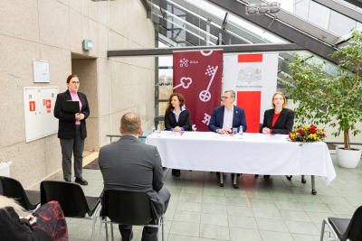 NKMP vadītāja Ināra Bula un Rīgas domes priekšsēdētājs Viesturs Kleinbergs, klātesot Latvijas Republikas kultūras ministrei Agnesei Lācei, paraksta sadarbības memorandu Rīgas domes telpās