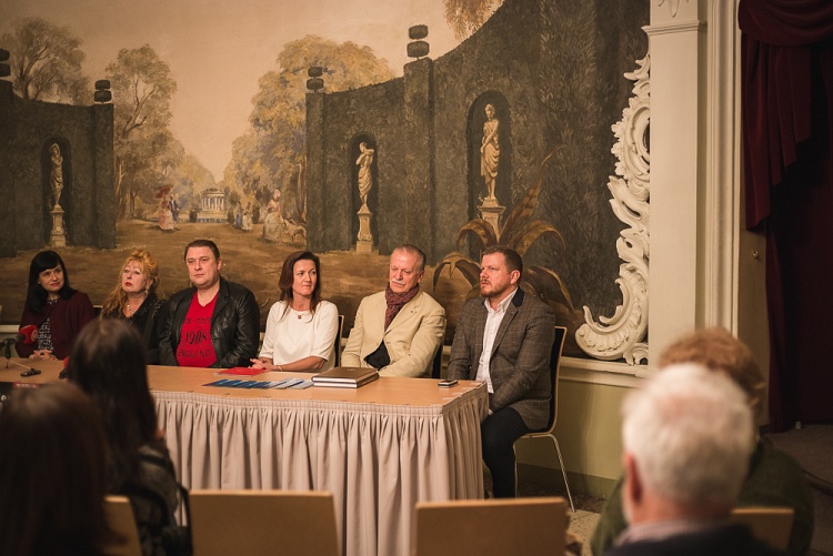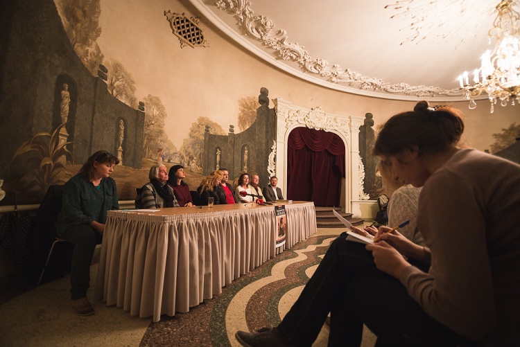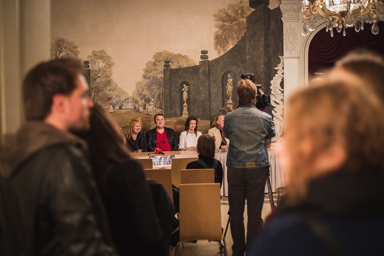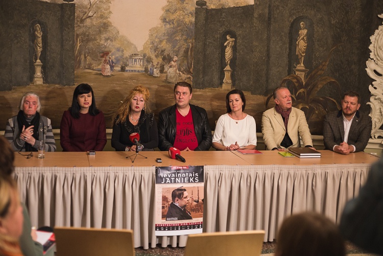 - Preses konferencē piedalījās (no kreisās) - Mākslas zinātniece un filmas konsultante Ingrīda Burāne; kinokritiķe Dita Rietuma; filmas režisore un producente Ilona Brūvere; galvenās lomas atveidotājs, aktieris Imants Strads; SIA Rīgas Nami valdes priekšsēdētāja Vineta Verika; Rīgas pieminekļu aģentūras direktors Guntis Gailītis un filmas komponists Ēriks Ešenvalds.
