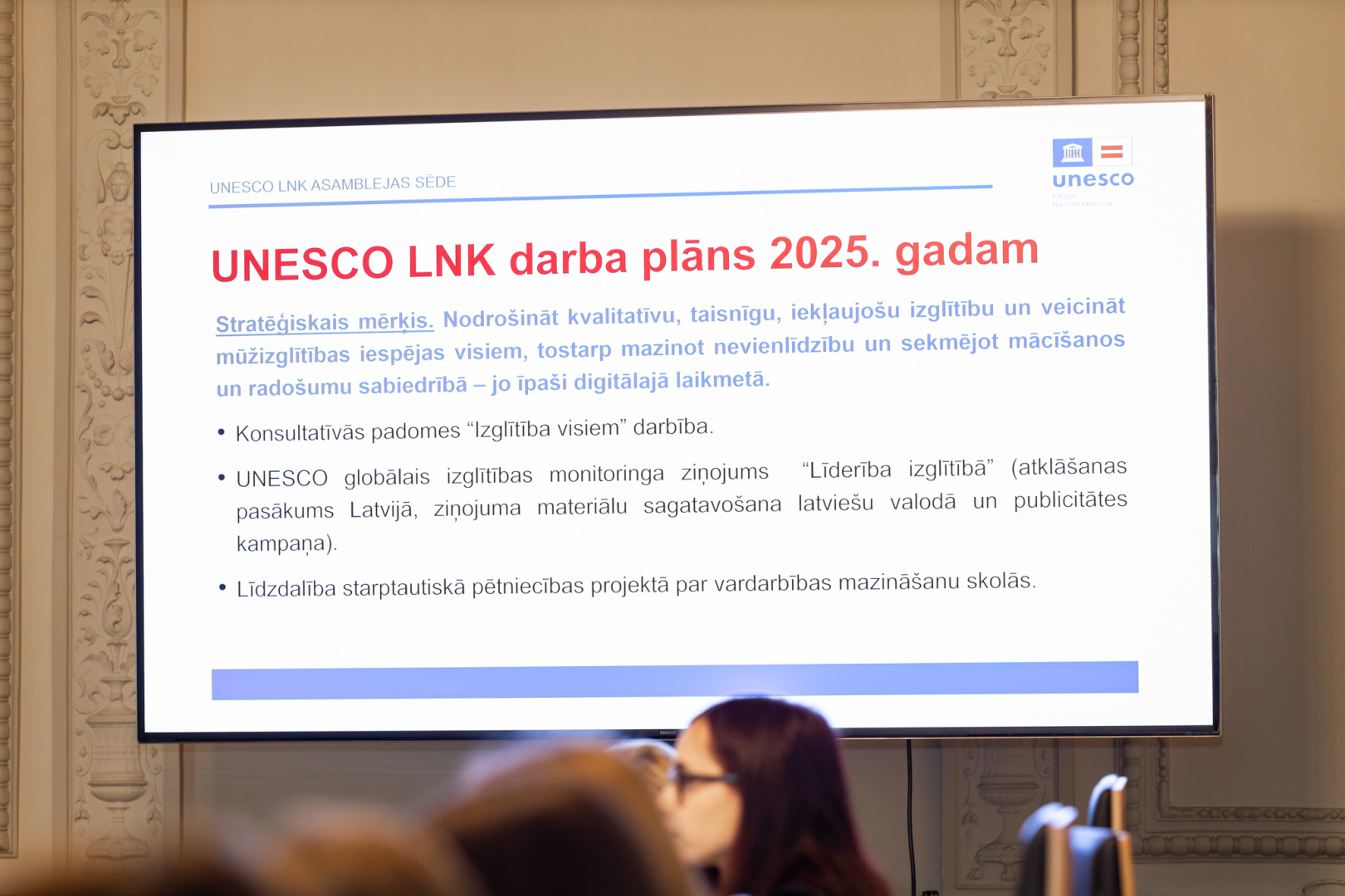 Šā gada pirmajā UNESCO Latvijas Nacionālās komisijas (LNK) asamblejas sēdē tās locekļi izskatīja un apstiprināja UNESCO LNK pārskatu par darbu 2024. gadā, kā arī darba plānu 2025. gadam. Tāpat asambleja pieņēma lēmumu par Latvijas kandidēšanu UNESCO starpvaldību institūcijās, izskatīja jautājumu saistībā ar UNESCO LNK tīkla “Stāstu bibliotēkas” turpmāko attīstību sadarbībā Latvijas Nacionālo bibliotēku un iepazinās ar UNESCO svinamo gadadienu kalendārā (2024 -2025) iekļauto Latvijas gadadienu - Latviešu grāmatas 500. gadadienas un Krišjāņa Valdemāra 200. gadadienas - atzīmēšanas pasākumiem.
